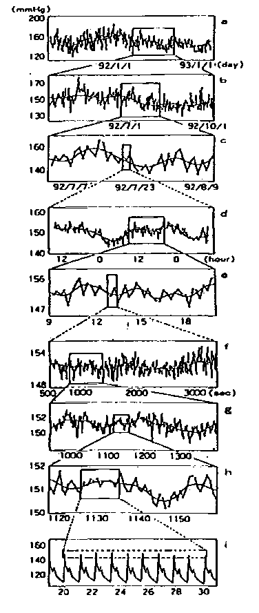 答 図0940は血圧の時系列データを示します.図0940の最上段(a図)の時系列では,年単位の時間スケールの“基底変動”が求められ,その時系列の任意の時間領域(四角囲み部分)を切り出して解析し,月単位の時間スケールの“基底変動”が求められます(b図).同様に,b図の任意時間領域(四角囲み部分)を切り出して解析し,日単位の時間スケールの“基底変動”が求まります(c図).MemCalcでは,こうした処理が極めて容易に実行できるようになっています.